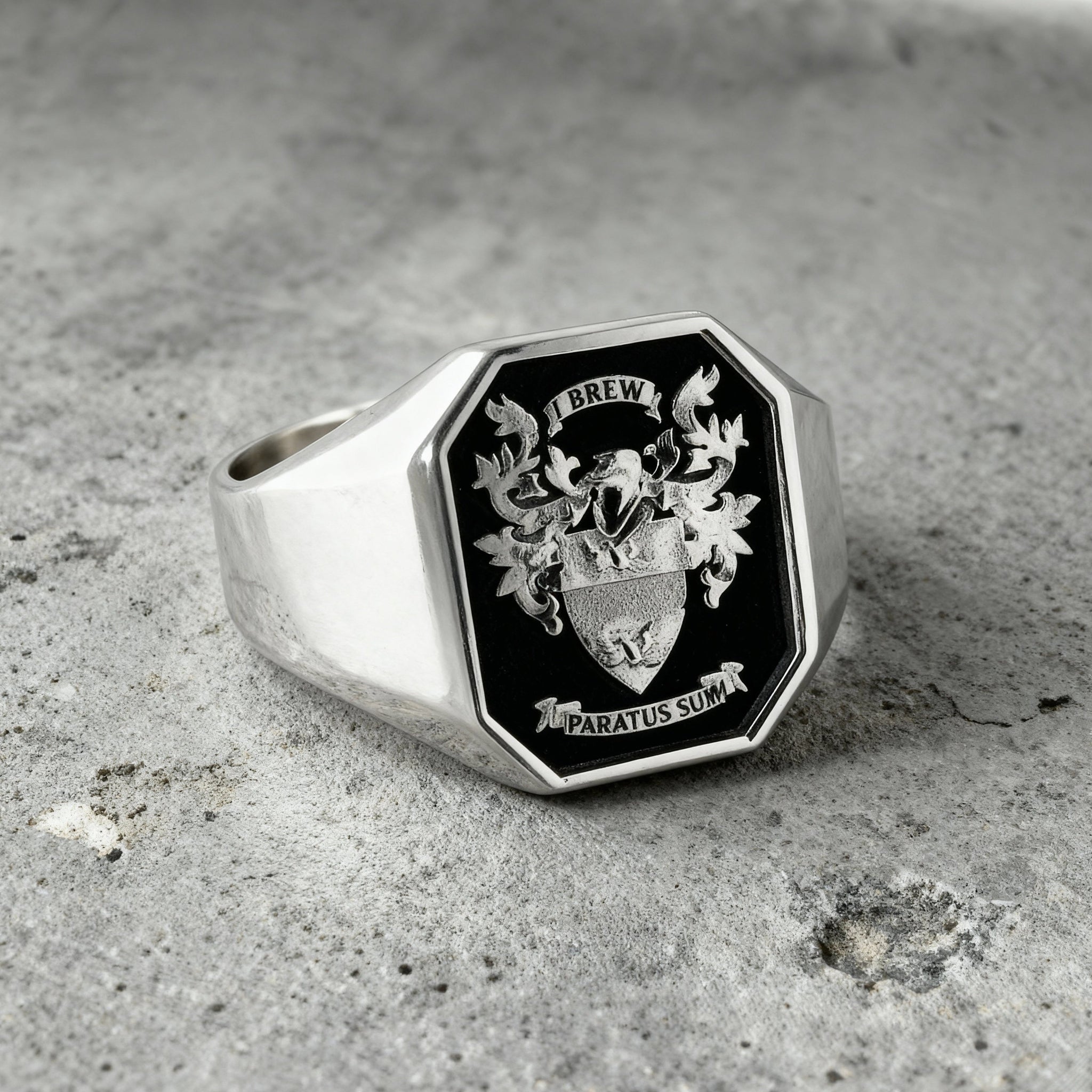 A coat of arms signet ring is a custom-made ring featuring your family’s unique coat of arms or crest. The design of the coat of arms crest is typically seal-engraved or, in modern times, raised in 3D on the ring’s face